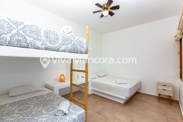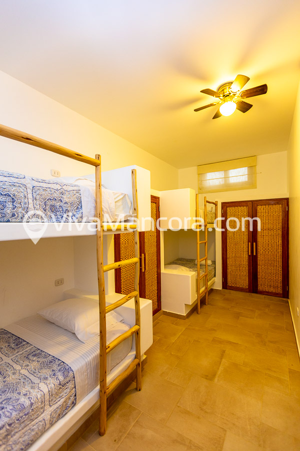 * Hab 6 : 1 cama King con 2 camarotes de plaza y media baño privado, kitchenette y terraza privada con una linda vista al mar, Tv y AC. (este también se alquila como bungalow privado para una familia o un grupo de 6 max)