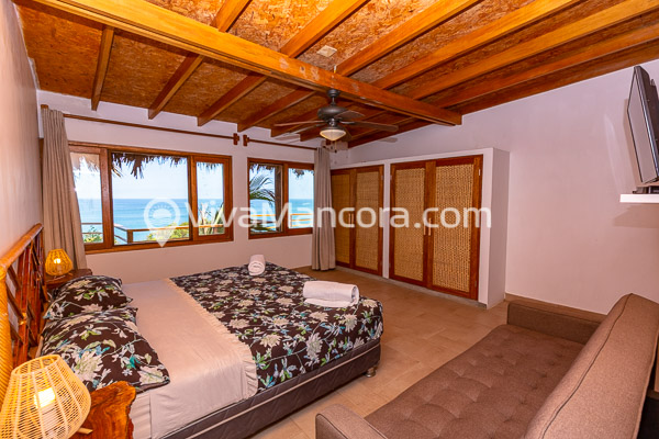 * Hab 2 : 1 cama king, 1 sofá cama de 1 plaza, baño privado, con vista al mar, TV y AC.