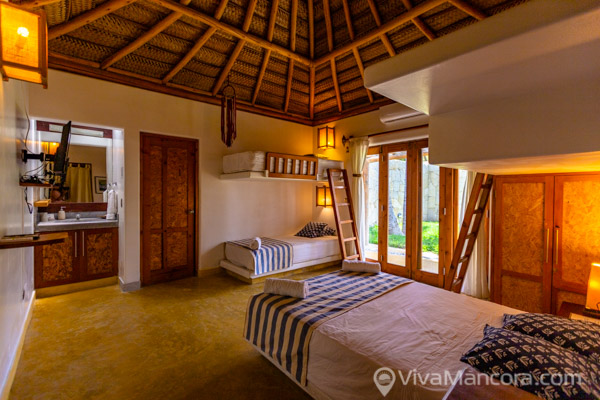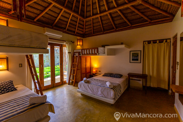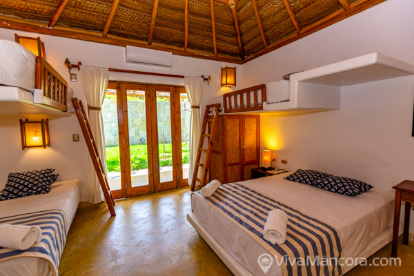 Cama de dos plazas, cama baja Twin, dos camas altas tipo litera; baño privado, aire acondicionado central, closet, televisión con pantalla plana y canales satelitales. Salida directa al jardín frontal.