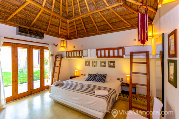 Cama King, dos camas altas tipo litera; baño privado, aire acondicionado central, closet, televisión con pantalla plana canales satelitales. Salida directa al jardín frontal.