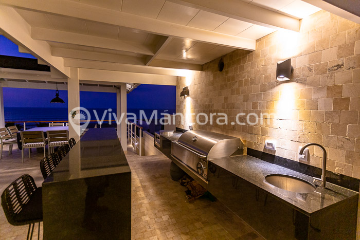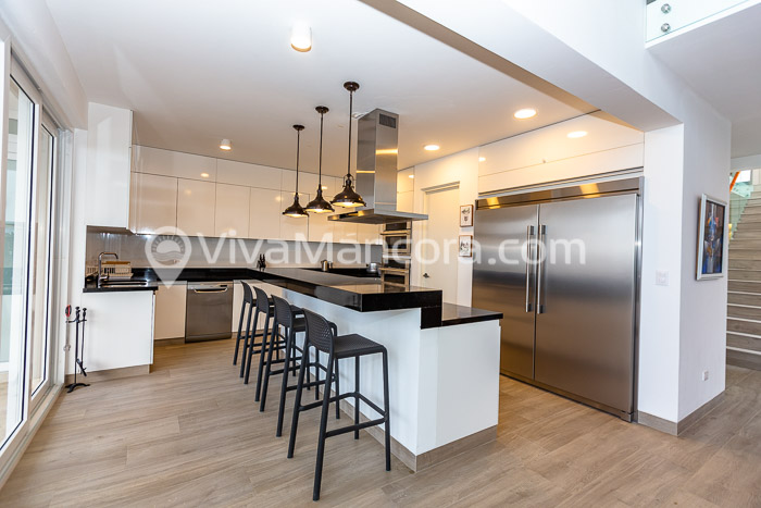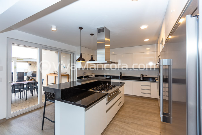 – Cocina full equipo con cocina central, lavaplatos y mesa bar para cuatro personas.