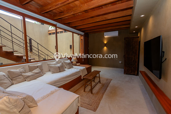 * Sala de TV con televisor, dos camas de plaza y media, closet y baño privado.
