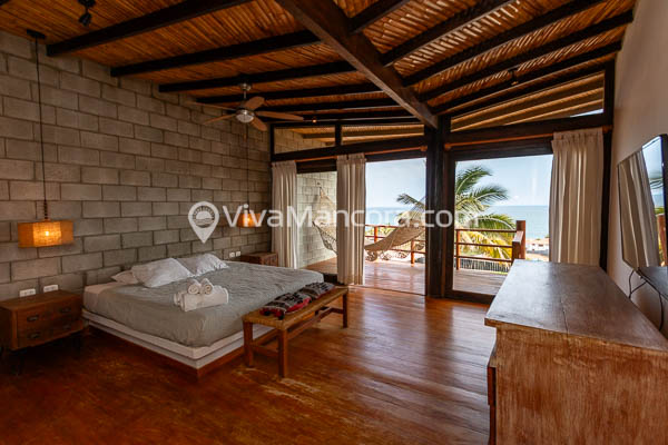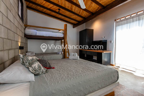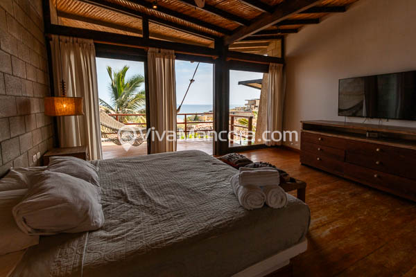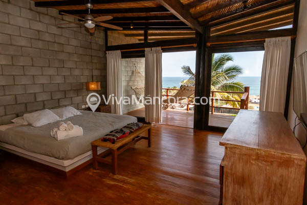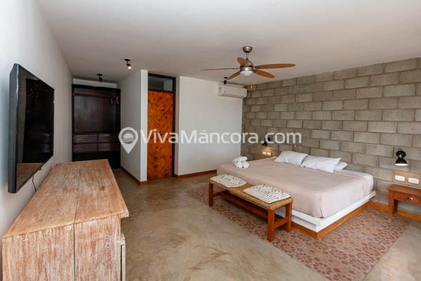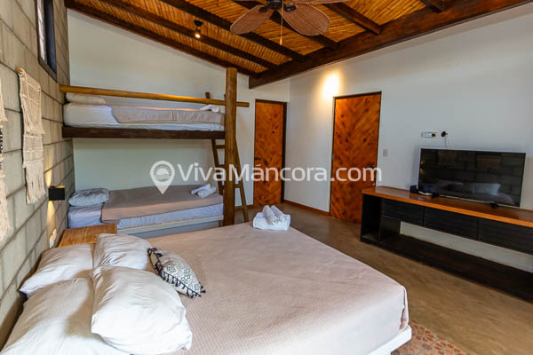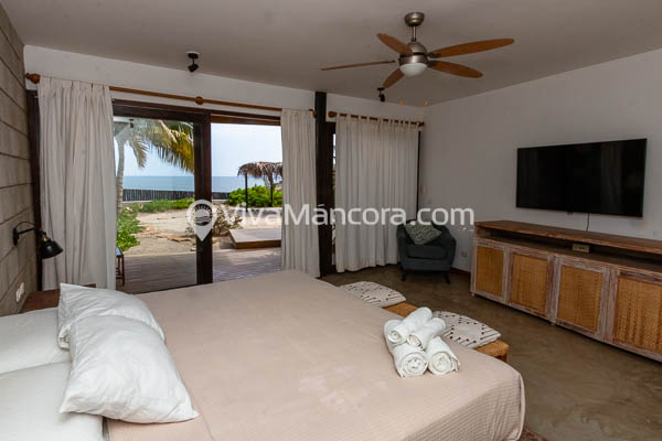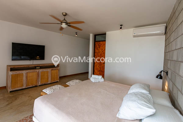 • Tres habitaciones matrimoniales con vista al mar. Cada una cuenta con balcón, una cama King, un televisor LED de 55 pulgadas, aire acondicionado, ventilador de techo, cómoda, closet y baño privado. Capacidad dos huéspedes por dormitorio.
