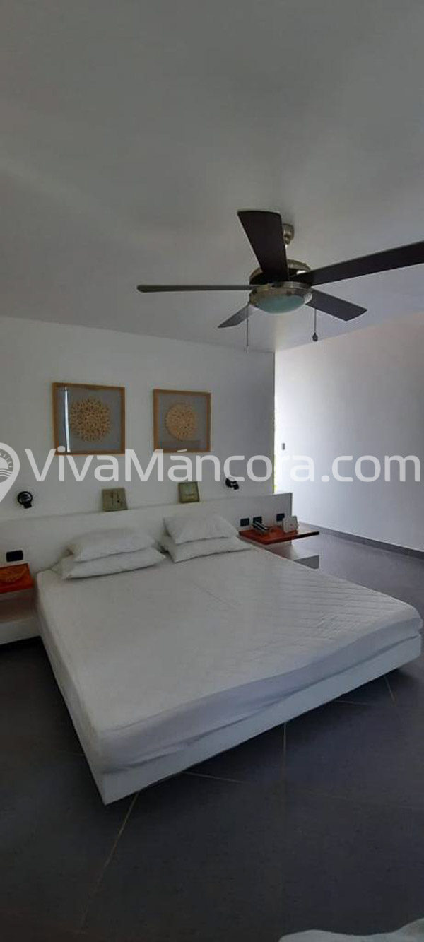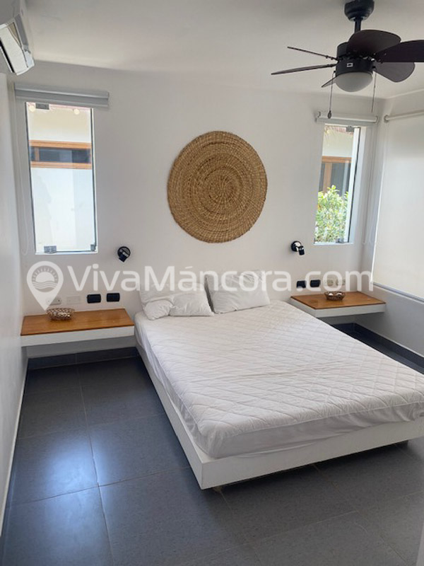 • 1 Dormitorio principal con cama King size, baño propio, aire acondicionado, ventilador de techo y TV.
