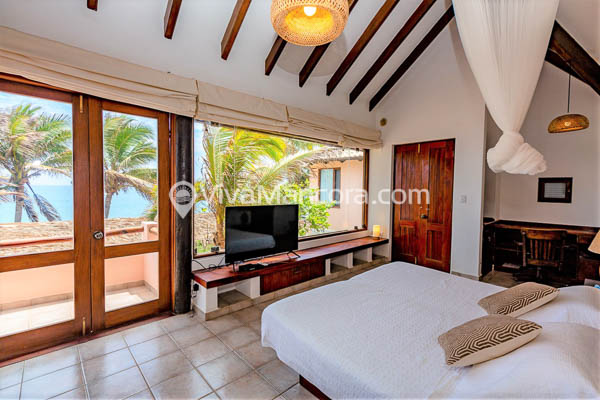 Dormitorio principal con cama king, walk-in closet, baño propio, terraza y amplia vista al mar.