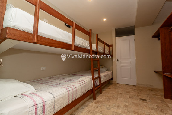 • Dormitorio familiar con 1 cama Queen y 2 camarotes.