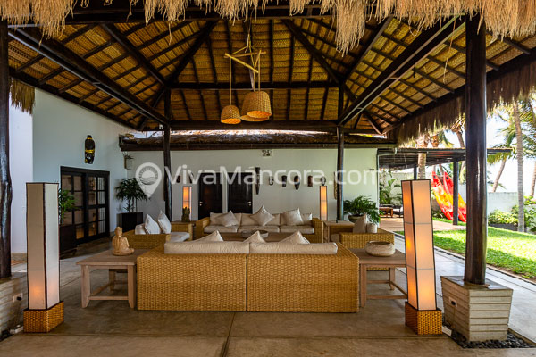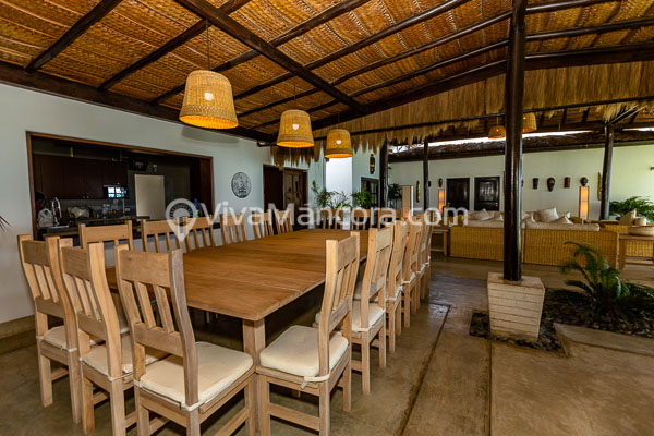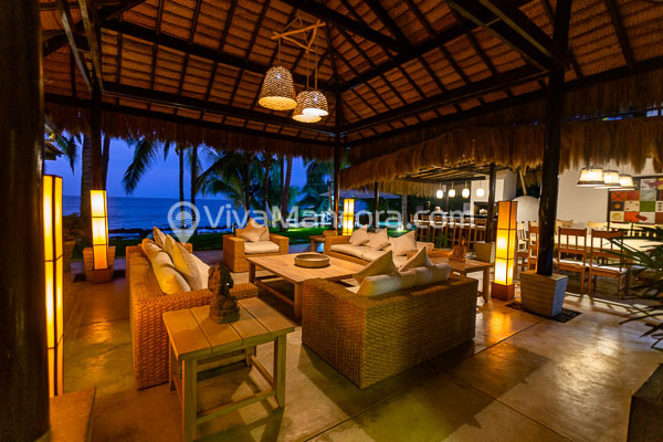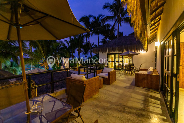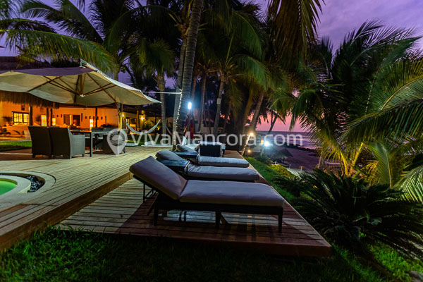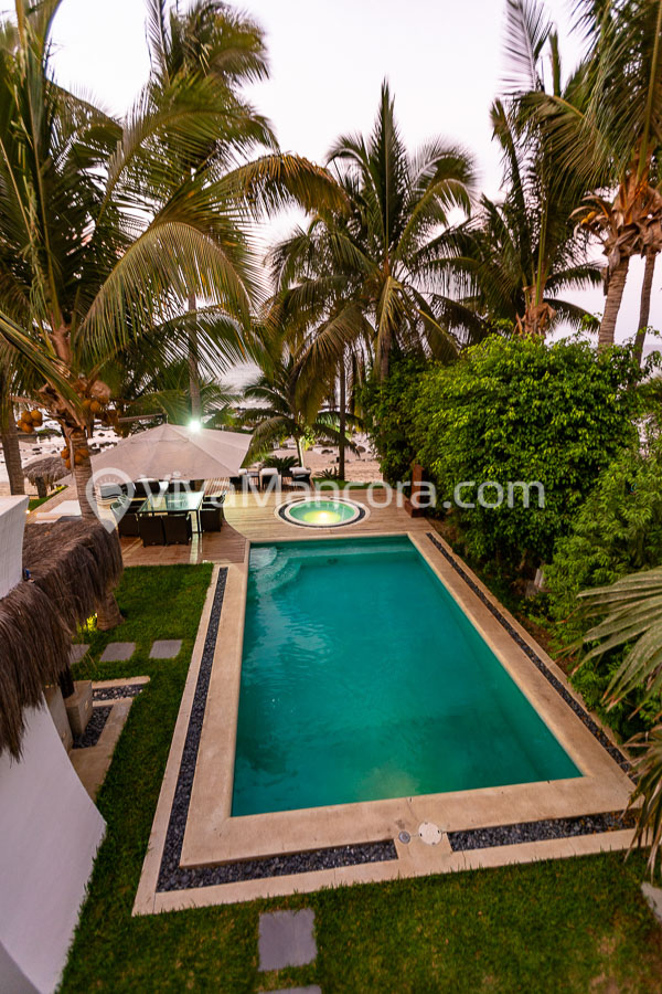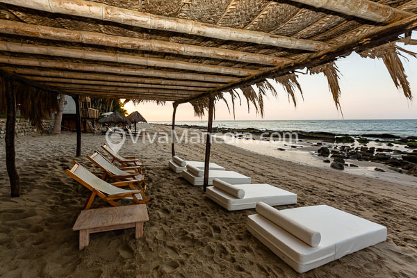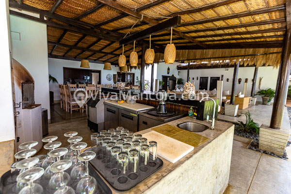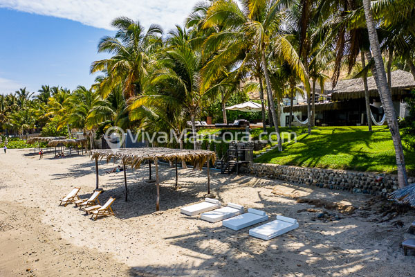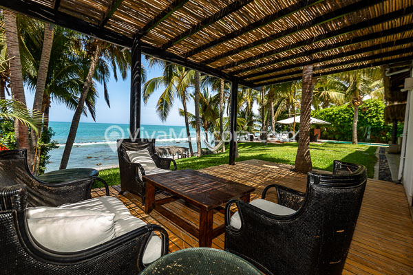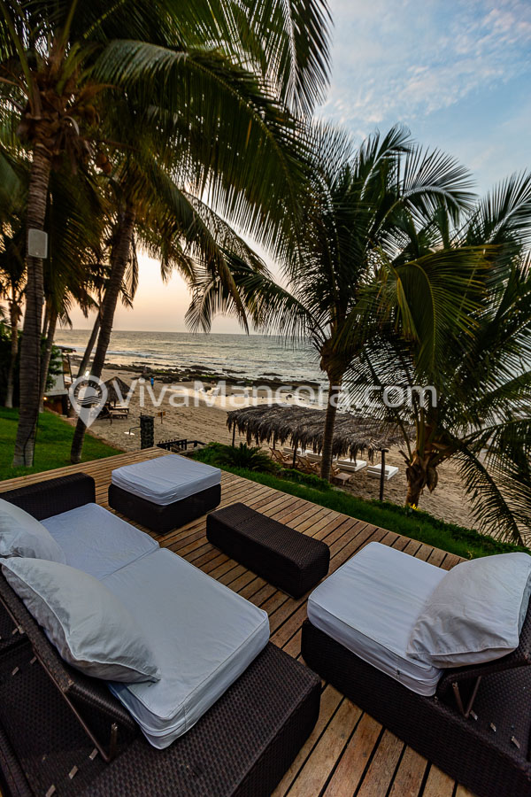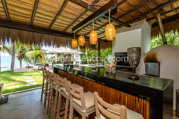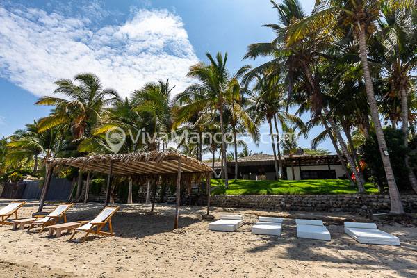 La zona de playa incluye sombras, tumbonas y camas colchonetas. En el primer piso se encuentra una amplia sala y comedor, cocina con 5 refrigeradores y 2 congeladores, un bar con una barra, horno de barro, cilindro y BBQ, todo con vista al mar.