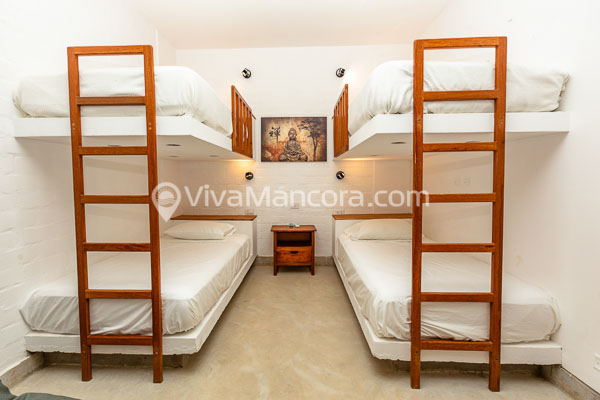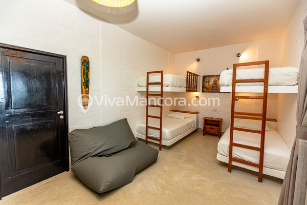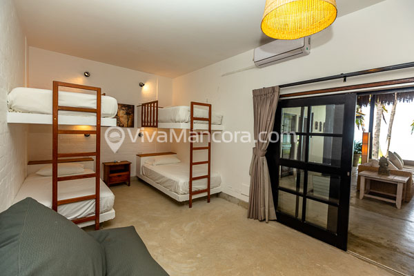 • Habitación 04: Habitación cuádruple con 2 camarotes tipo L, baño privado y terraza vista al mar.