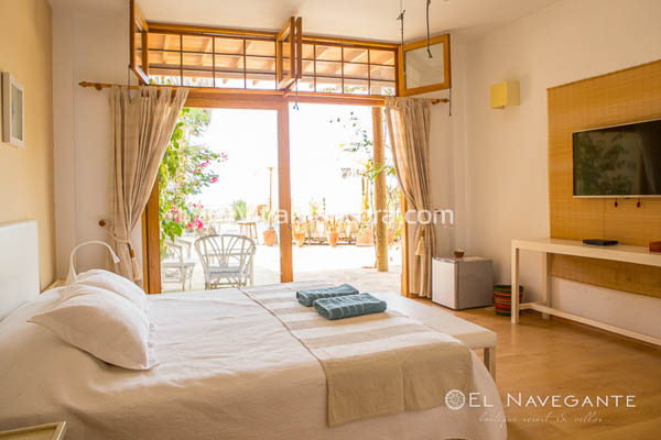 8 Dormitorios con vista al mar y piscina, con terraza propia, cada uno con baño propio, Smart TV, caja de seguridad, frigobar, ventilador de techo y de piso.