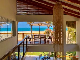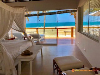 Sala amplia, bar, con vista al jardín, arena y mar.