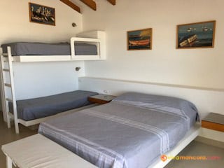 Un cuarto matrimonial con cama Queen, camarote para dos personas, closet, baño propio, vista al mar y salida al deck de madera.