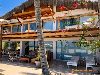 Deck de arena privado con sombrilla permanente y varios banquitos de playa para su comodidad.