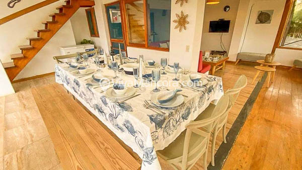 Cocina completamente equipada, con amplia barra de madera de hualtaco y 4 bancos altos, integrada a la sala.